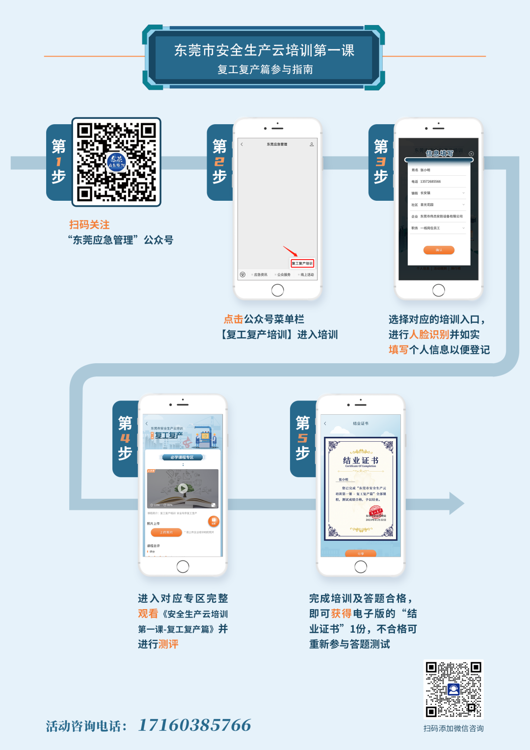 參與指南:關(guān)注“東莞應(yīng)急管理”公眾號(hào),通過(guò)點(diǎn)擊公眾號(hào)菜單欄【線(xiàn)上活動(dòng)→復(fù)工復(fù)產(chǎn)培訓(xùn)】,登記個(gè)人信息,完成注冊(cè)后,點(diǎn)擊“我要參加”進(jìn)入培訓(xùn)內(nèi)容界面,點(diǎn)擊觀看視頻進(jìn)行學(xué)習(xí)。
